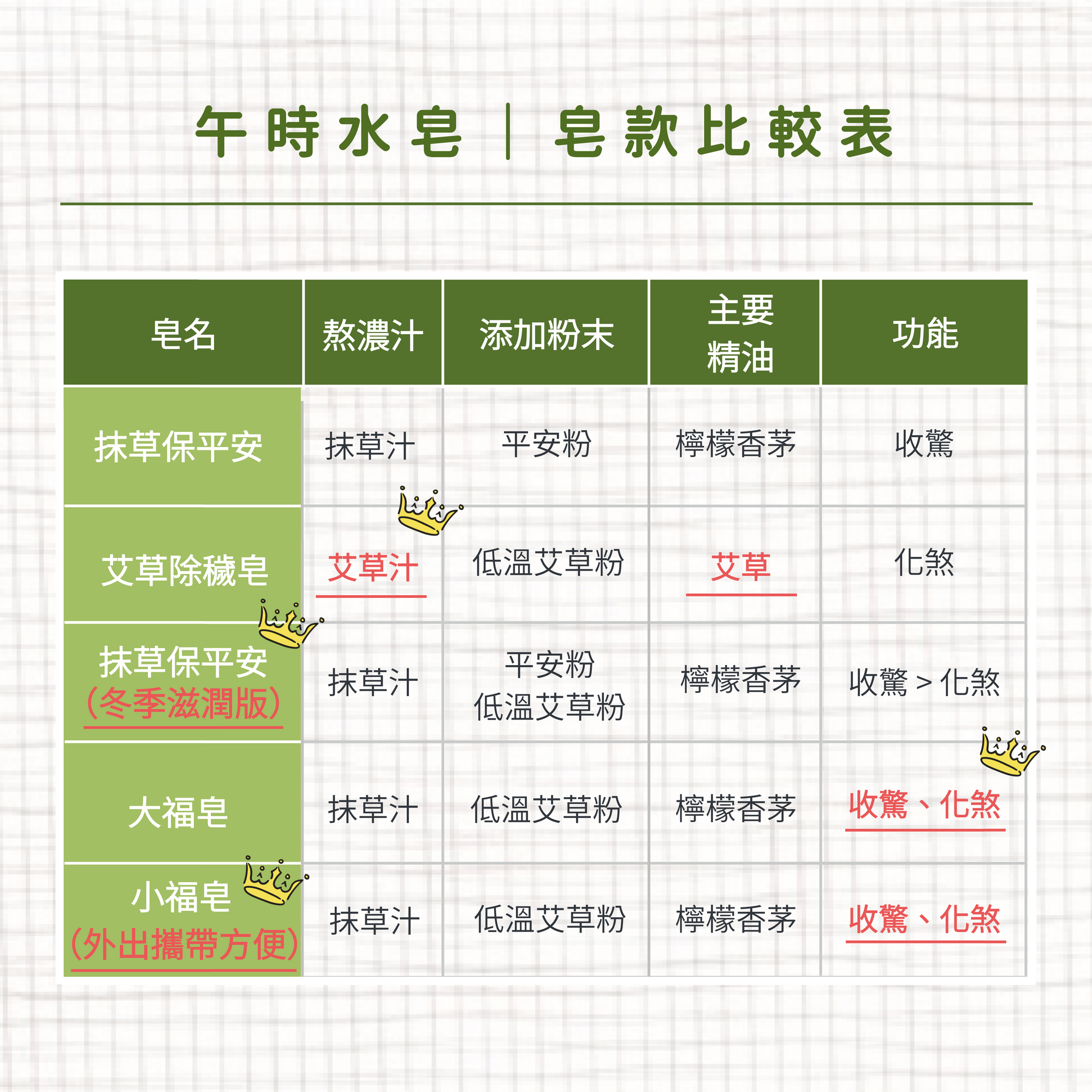 - 大、小福皂:新鮮抹草熬汁入皂+低溫艾草粉潤色。抹草、艾草一半一半